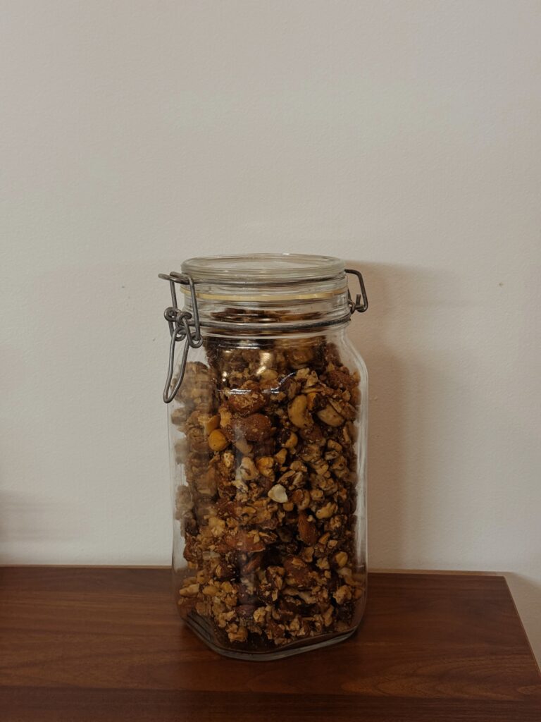 4. Drizzle with honey and add egg whites until everything is lightly coated and sticks together.